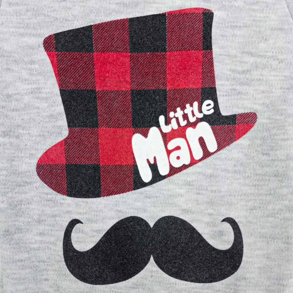 Κορμάκι για μωρό με μακριά μανίκια, με print από καρό κόκκινο-μαύρο καπέλο, με την φράση “Little Man”. Στο κάτω μέρος του print ένα τσιγκελωτό μαύρο μουστάκι κλέβει την παράσταση. Είναι βαμβακερό 100% και κλείνει στο κάτω μέρος με 2 κλιπς για εύκολη αλλαγή πάνας. Στη λαιμόκοψη έχει επίσης κουμπάκια με clips για εύκολο πέρασμα του βρεφικού κεφαλιού.