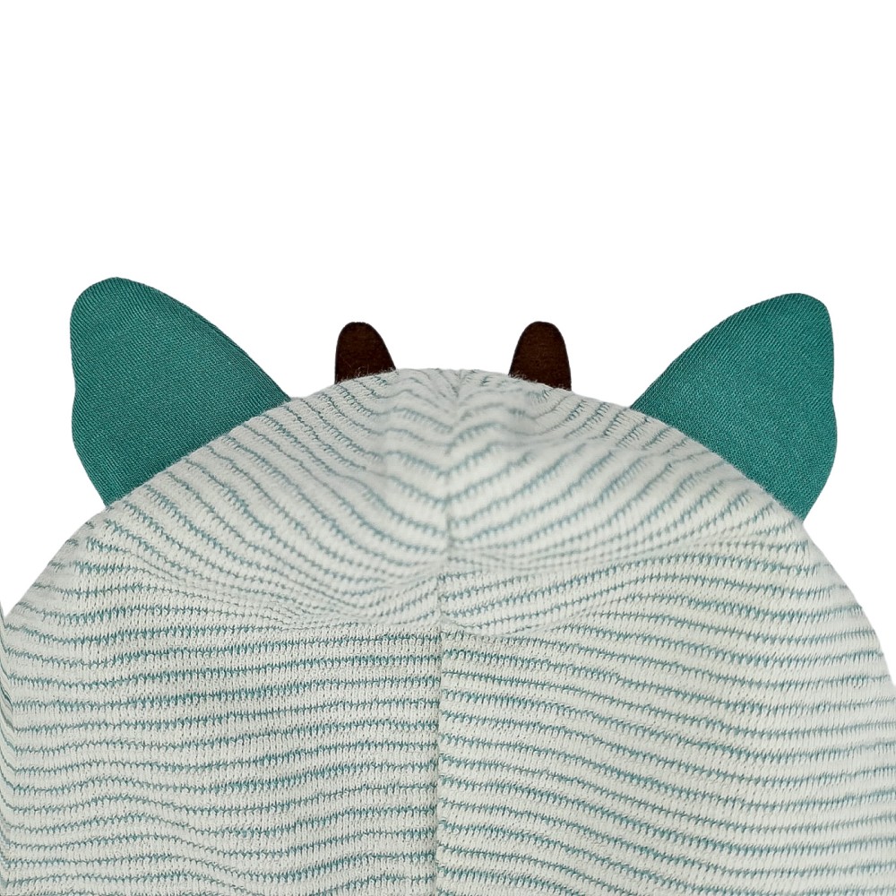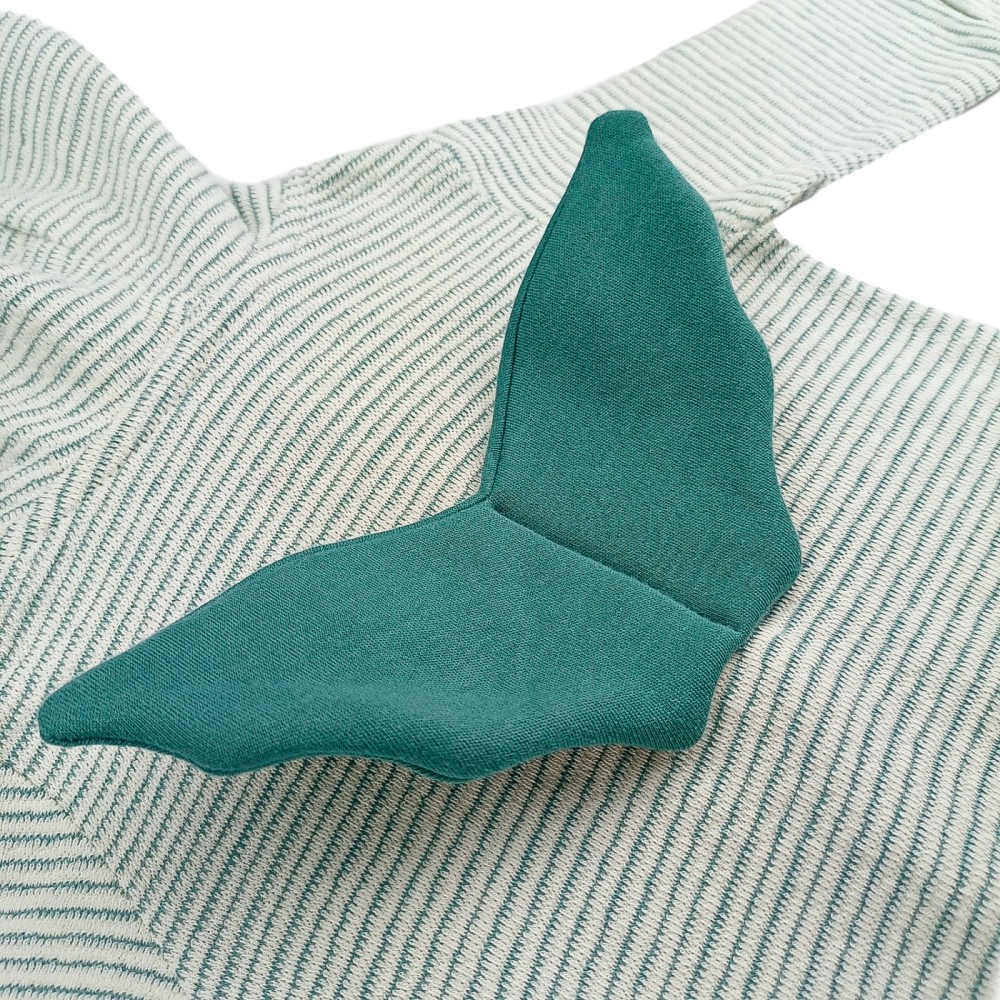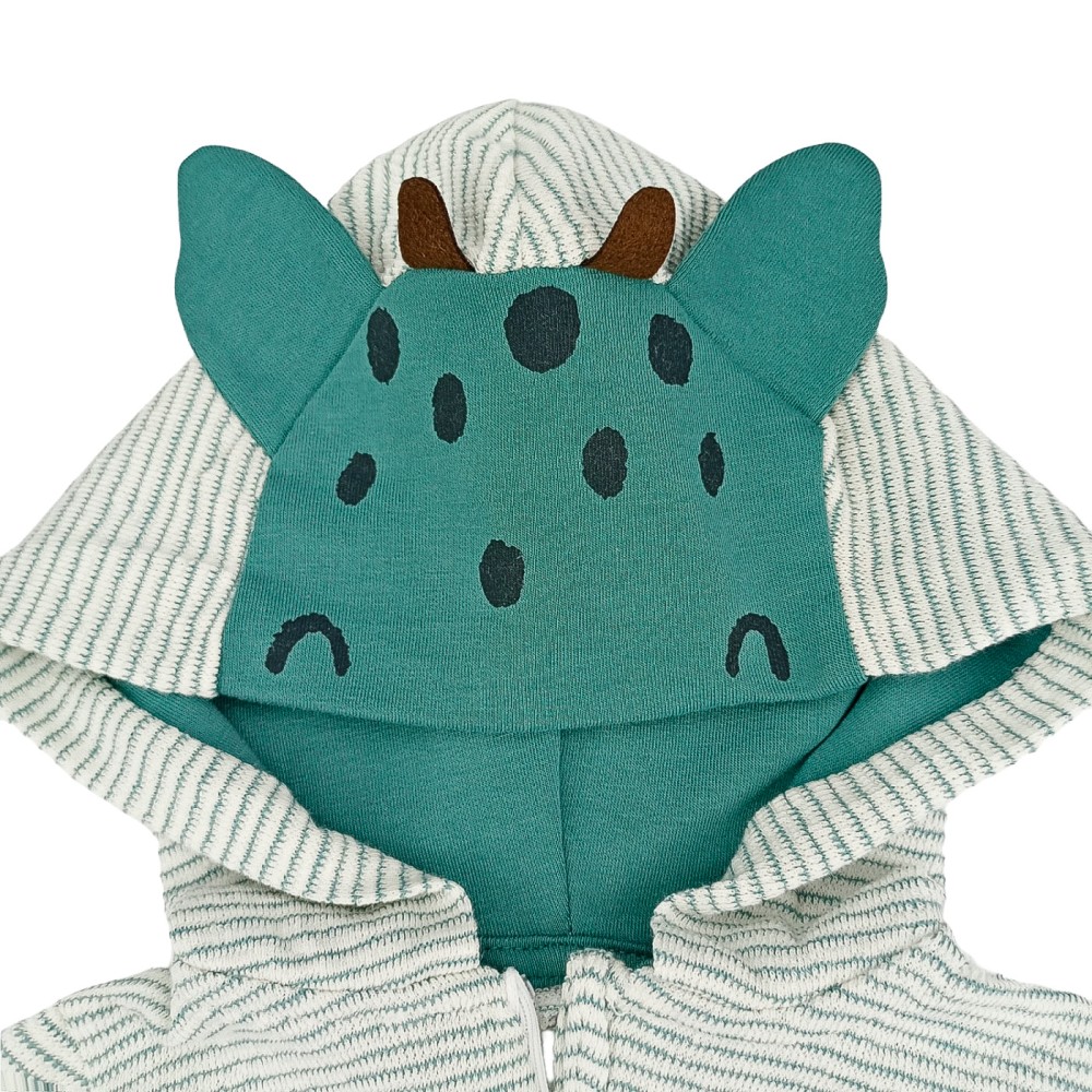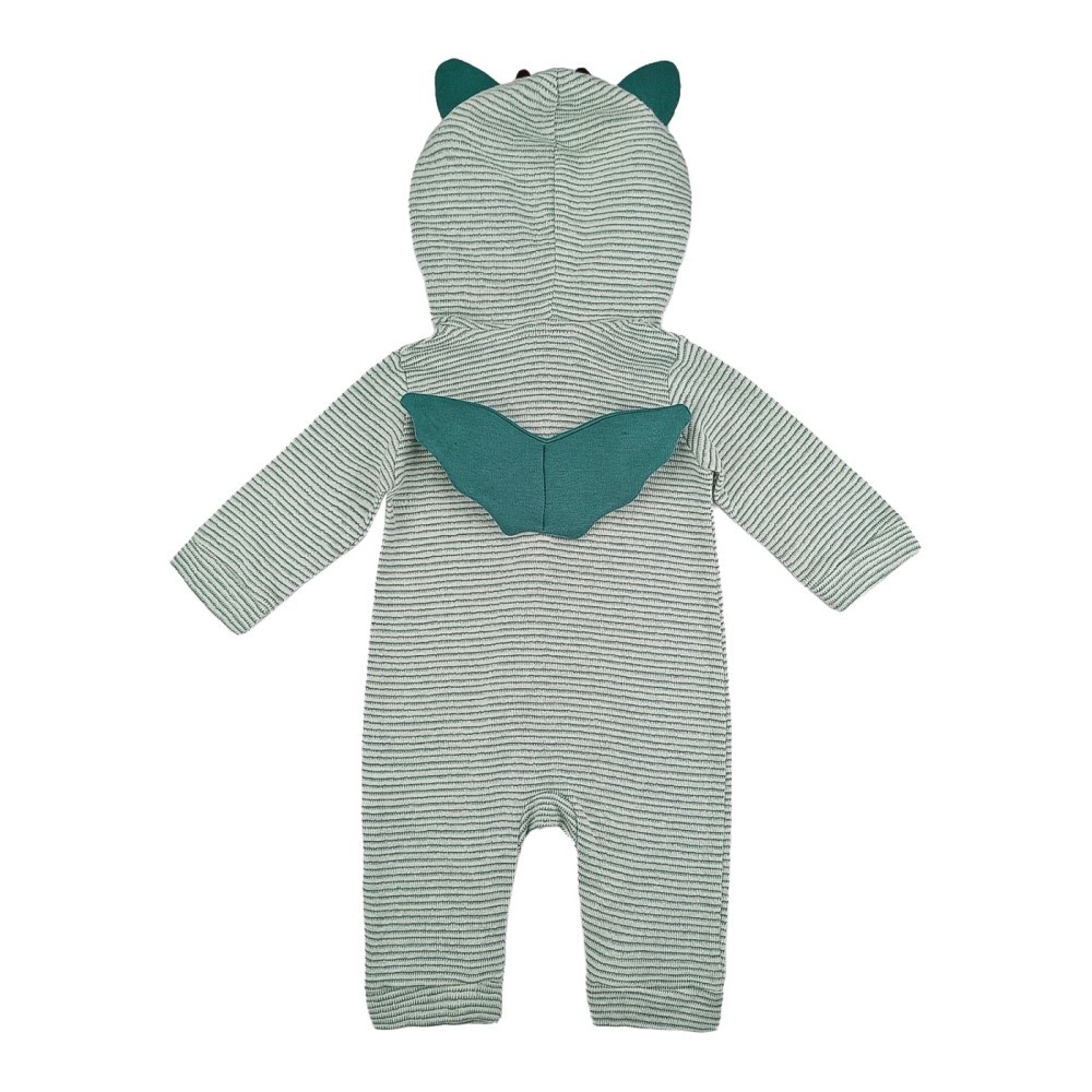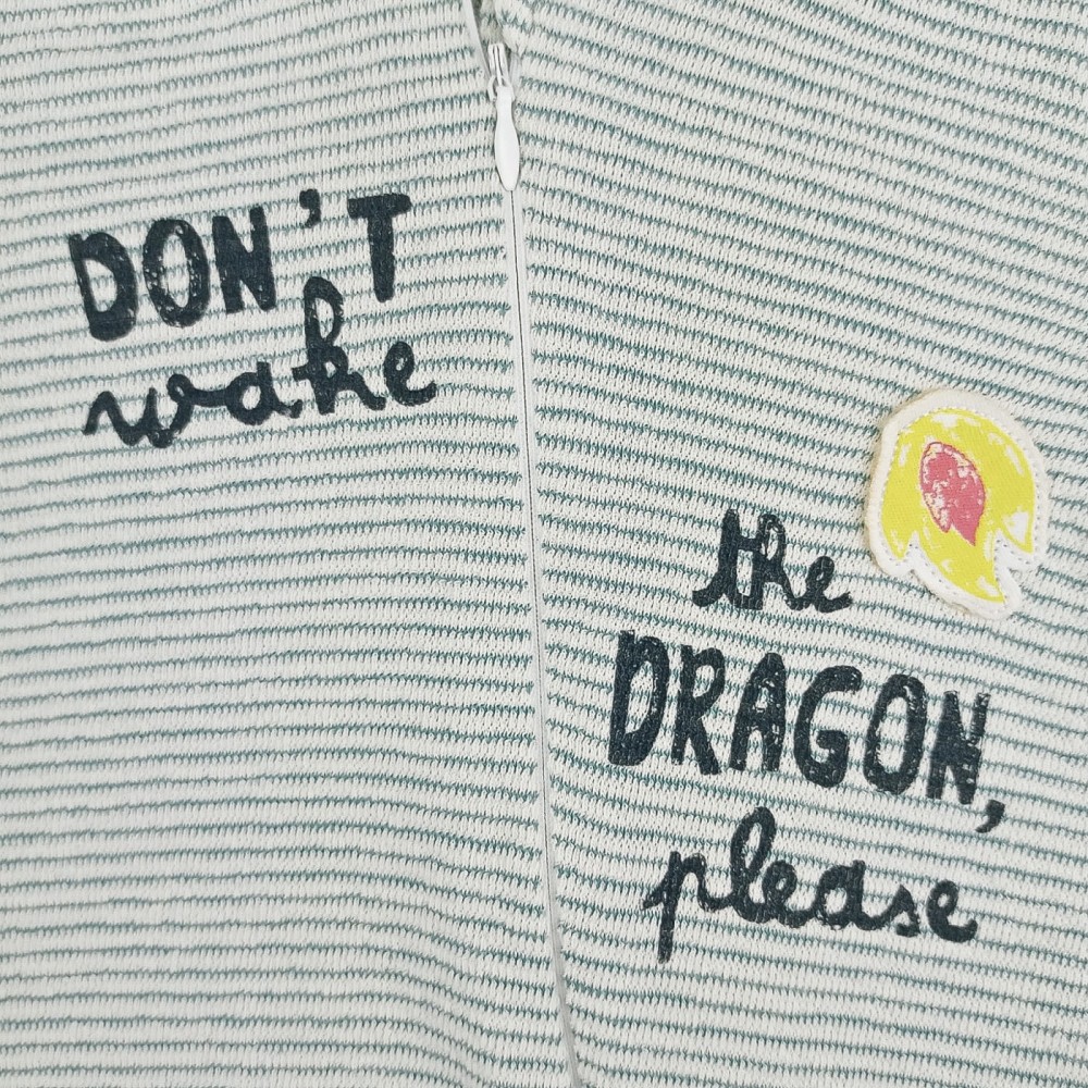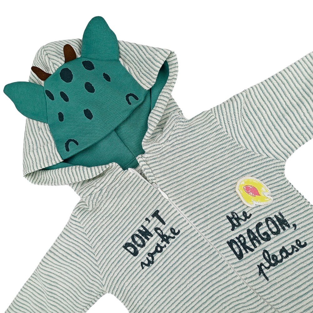 Βαμβακερό βρεφικό φορμάκι με μακρύ μανίκι και κουκούλα, που κουμπώνει μπροστά λοξά με φερμουάρ. Είναι ριγέ σε λευκή βάση, με πράσινες ρίγες στην πλέξη και στο στήθος έχει τη φράση “Don’t wake the DRAGON, please”. Η κουκούλα είναι επενδυμένη εσωτερικά με μονόχρωμο πράσινο βαμβακερό ύφασμα και ένα απλικαρισμένο πράσινο κεφαλάκι δράκου με 3D αυτάκια και κερατάκια. Στην πλατούλα είναι ραμμένα πράσινα φτερά δράκου με μαλακό εσωτερικό αφρολέξ.