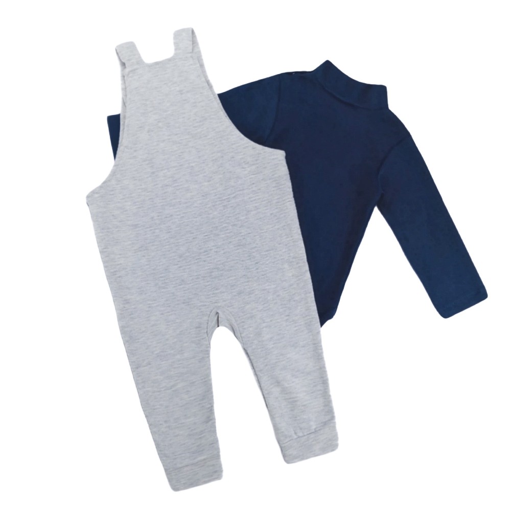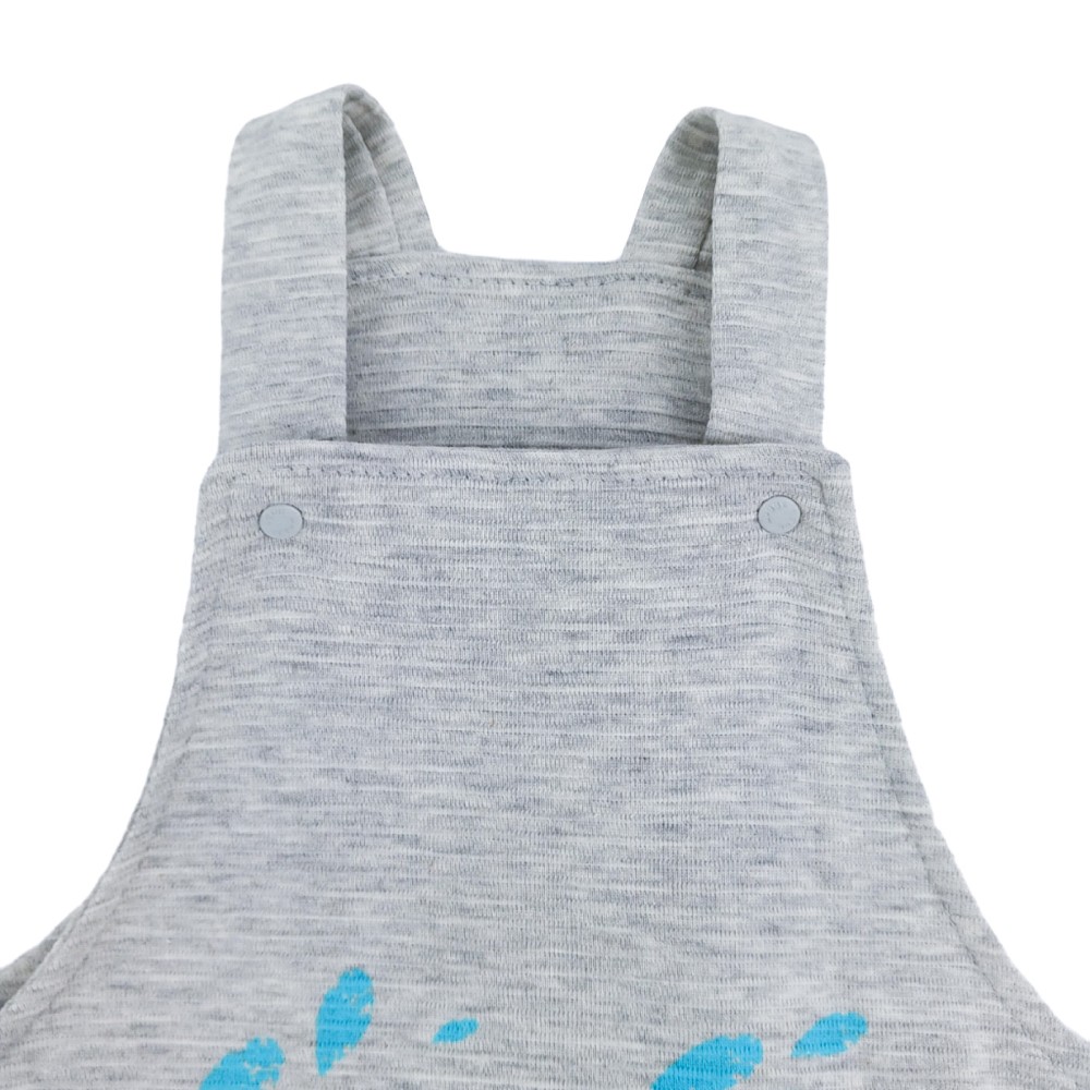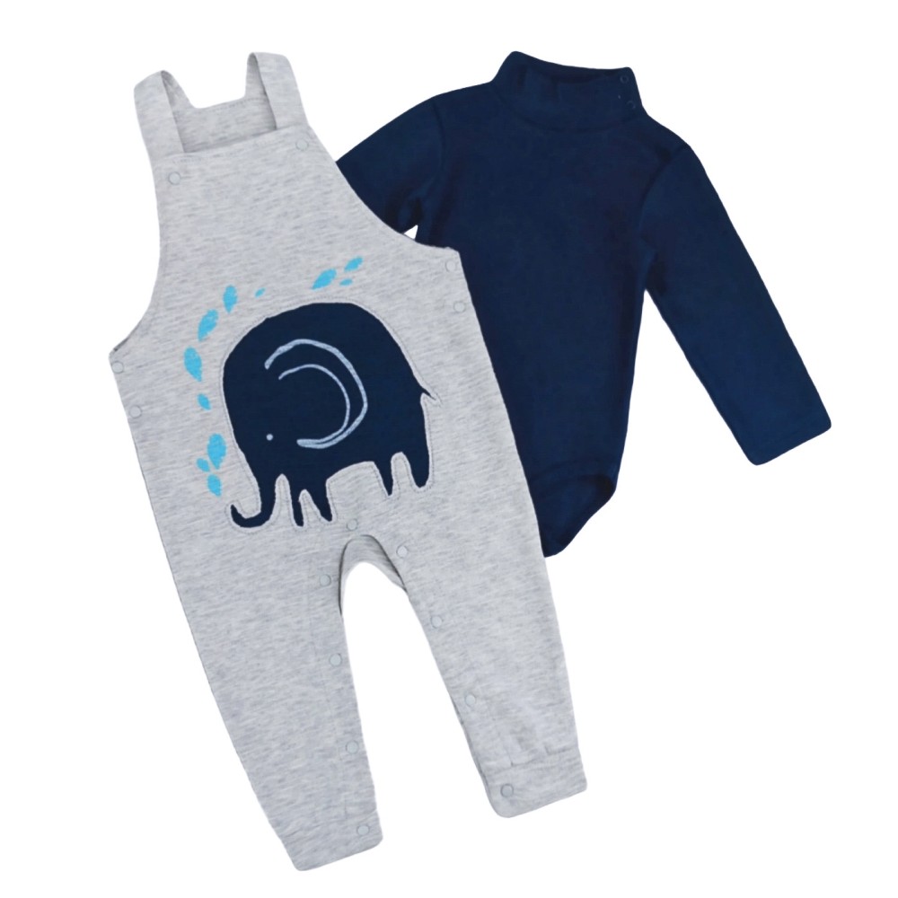 Σαλοπέτα με απλικαρισμένο ελεφαντάκι και ανάγλυφες οριζόντιες ρίγες στην ύφανση. Οι τιράντες έχουν από 2 ασορτί τρουκς κουμπάκια σε δύο σημεία, για να ρυθμίζονται ανάλογα με το ύψος του παιδιού. Κουμπάκια κλιπς υπάρχουν στο πλάι της μέσης και διατρέχουν όλο το κάτω μέρος της σαλοπέτας για εύκολη αλλαγή πάνας. Η σαλοπέτα είναι συνδυασμένη με μακρυμάνικο φορμάκι ζιβάγκο, το οποίο κλείνει με 3 κουμπάκια κλιπς δίπλα στη λαιμόκοψη, για εύκολο ντύσιμο.
