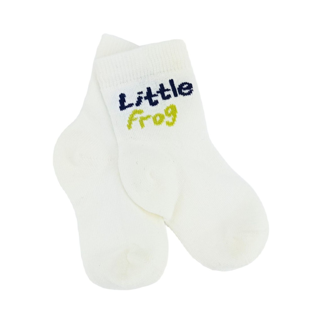Τρία ζευγάρια κάλτσες μωρού με θεματική βάτραχος σε 3 χρώματα. Το μπλε ζευγάρι εικονίζει ένα βάτραχο, το λευκό αναγράφει "Little Frog" με μπλε-λαχανί και γράμματα και το λαχανί ζευγάρι έχει λευκές ρίγες. Θα αγκαλιάσουν τα μωρουδιακά ποδαράκια με διασκεδαστικό και άνετο τρόπο.