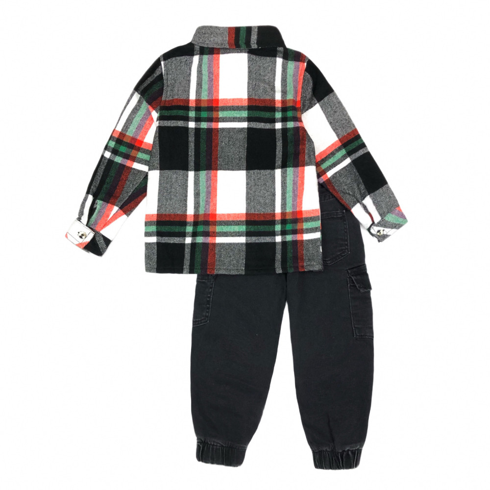 Παιδικό σετ που αποτελείται από καρό πουκάμισο φανέλα και ελαστικό τζιν παντελόνι. Το πουκάμισο είναι καρό σε αποχρώσεις μαύρου, λευκού, άσπρου, πορτοκαλί και πράσινου και έχει δύο στυλάτες τσέπες στο στήθος. Κλείνει μπροστά με τρίχρωμα, κοκάλινα κουμπιά. Το παντελόνι είναι τζιν σε χρώμα μαύρο και έχει 6 τσέπες εκ των οποίων η μία πλαϊνή, είναι εξωτερική και κλείνει με κουμπάκι. Στη μέση σφίγγει με εσωτερικό λάστιχο και δένει διακοσμητικό, χοντρό κορδόνι, μαύρου χρώματος.